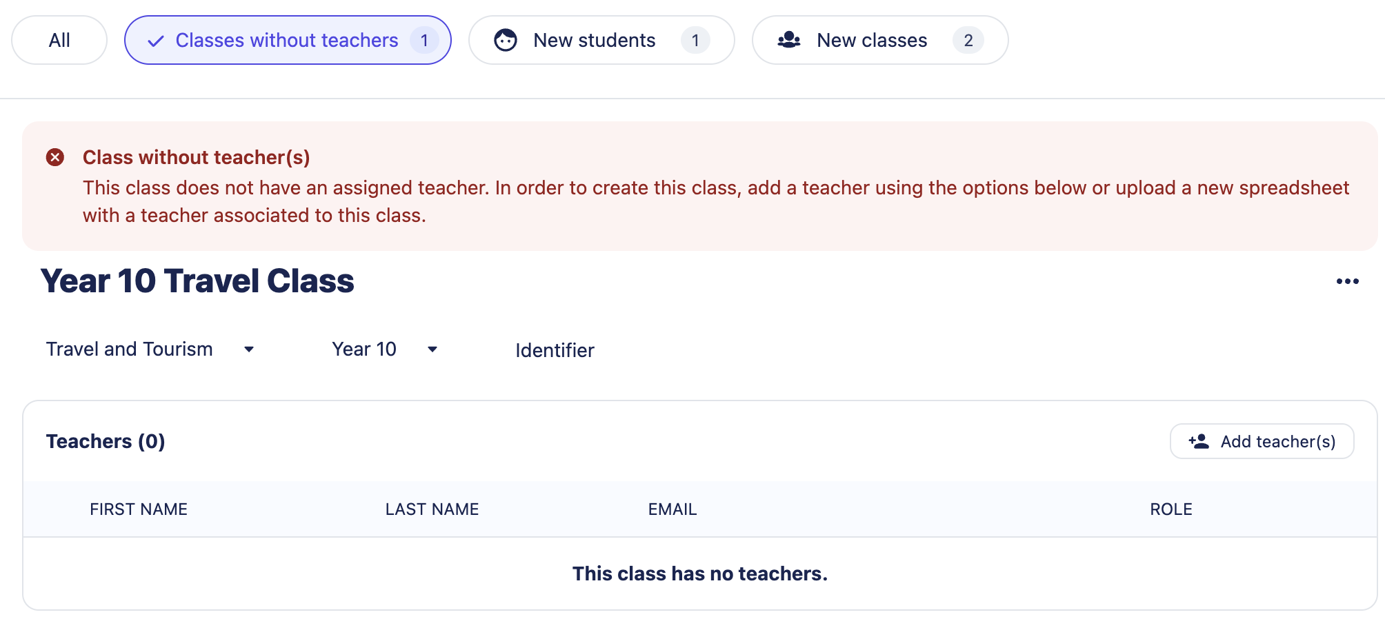 Classes without teachers - If you have included any classes within your file that do not have a teacher associated to them, you will see this error and you will not be able to proceed until this has been resolved. You'll be given the opportunity to add existing teachers in your school to the class via an Add teacher(s) button, alternatively you can discard your enrolment, add the required teachers to your file and re-upload the data.