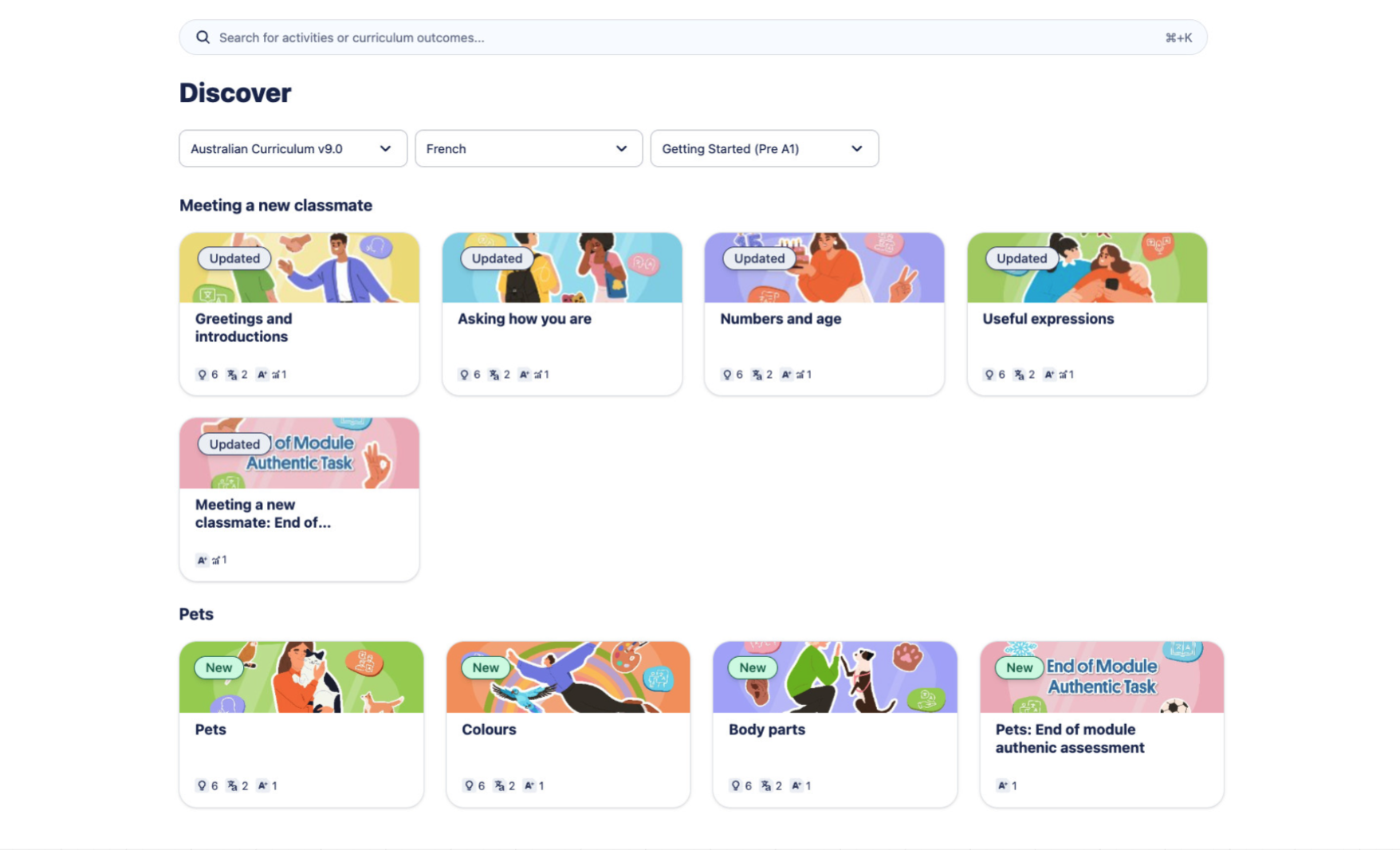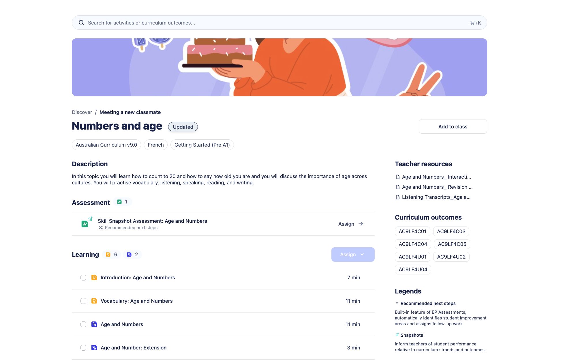 Add to class to add topics to our Course Planner where you can curate topics from Discover, and organise them into a sequence for each class.