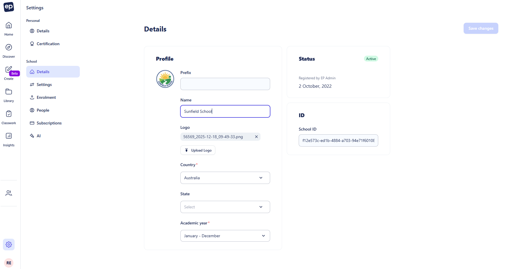 In the Details tab, any fields that are not disabled are editable. This includes the school name, location and logo. You're also able to set the academic year format that your school follows, this will be applied to any class created within your school and will help to ensure your schools classes remain active throughout your school year. The two options here are: