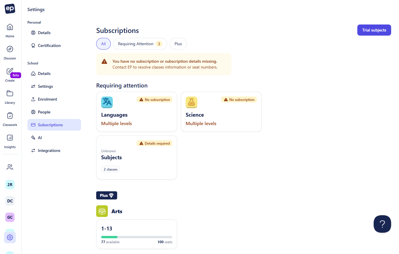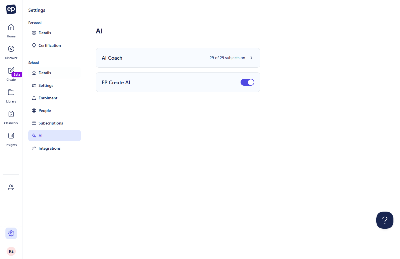 EP Create AI: a single toggle to enable or disable EP Create AI features across your entire school.