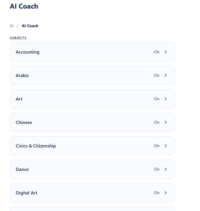 AI Coach: Click into AI Coach to see a list of all subjects in your school, each with an individual on/off toggle. This allows you to enable or disable AI Coach at the subject level.