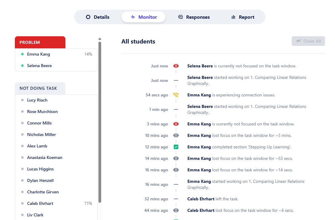 Click the Monitor tab. Students who have been assigned the work are displayed on the left-hand side of the page. Here you can see their current status and their completion rate. Any students encountering an issue will be highlighted.
