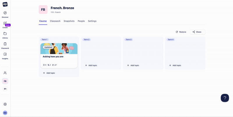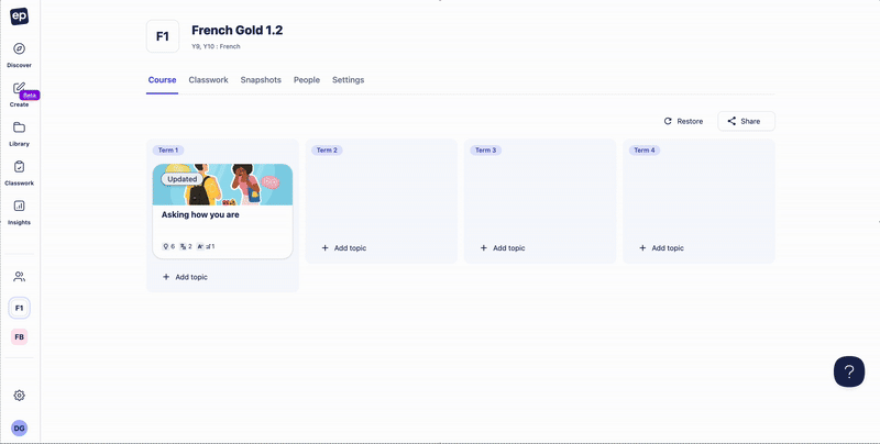 In each Class view, you’ll see the Course tab which features four “swimlanes” to help teachers organise and assign content for the academic year.