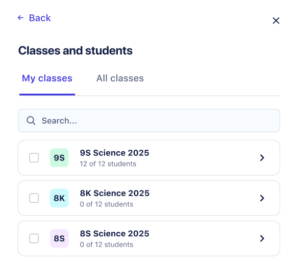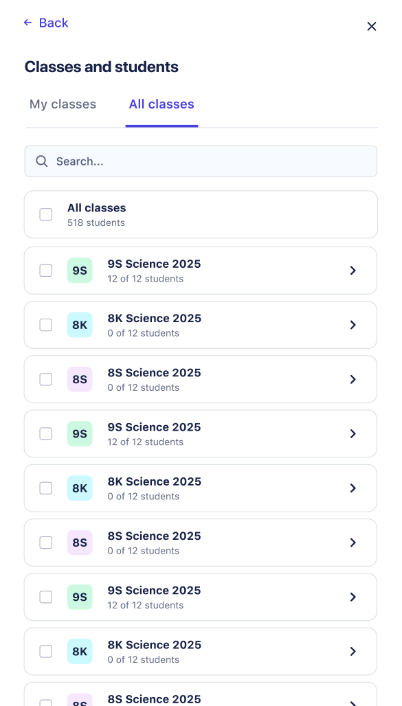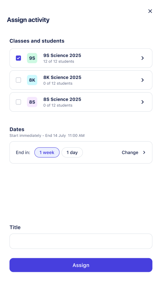 Teachers can specifically assign activities to single or multiple classes and the students within. Assignments can also be given to selected students.