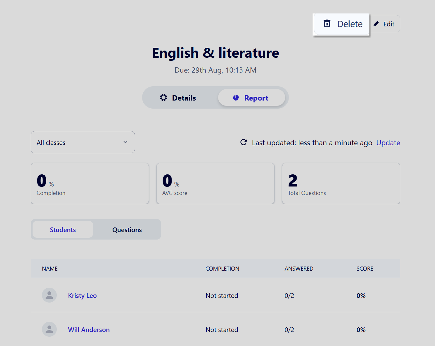 You can delete an assignment from the Details or Report pages after it has been assigned. This is useful for removing tasks that were assigned in error or are no longer needed.
