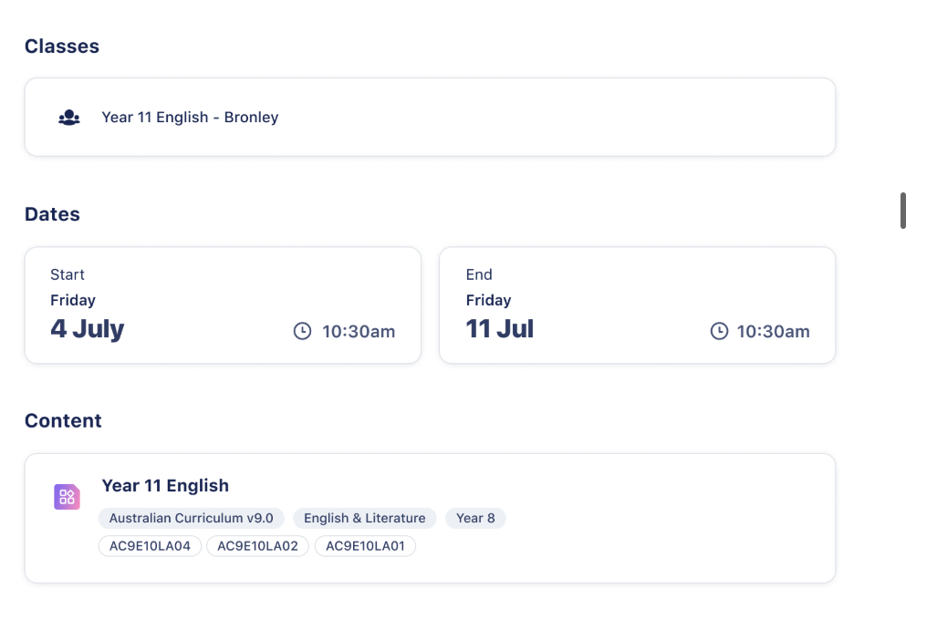 - Content: the activity that has been assigned, including the title, curriculum, subject, and outcome code specified during activity creation