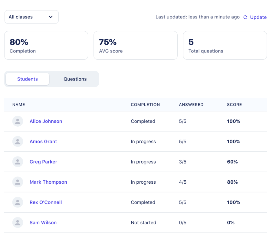 If a teacher has assigned an activity to multiple classes, they can click on the class switcher dropdown to view each class's results.