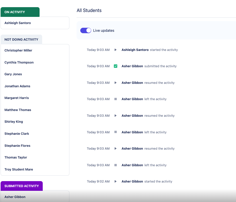 The Monitor tab lets you see exactly what your students are doing while they're completing a Content 2.0 activity - no need to wait until it's finished.