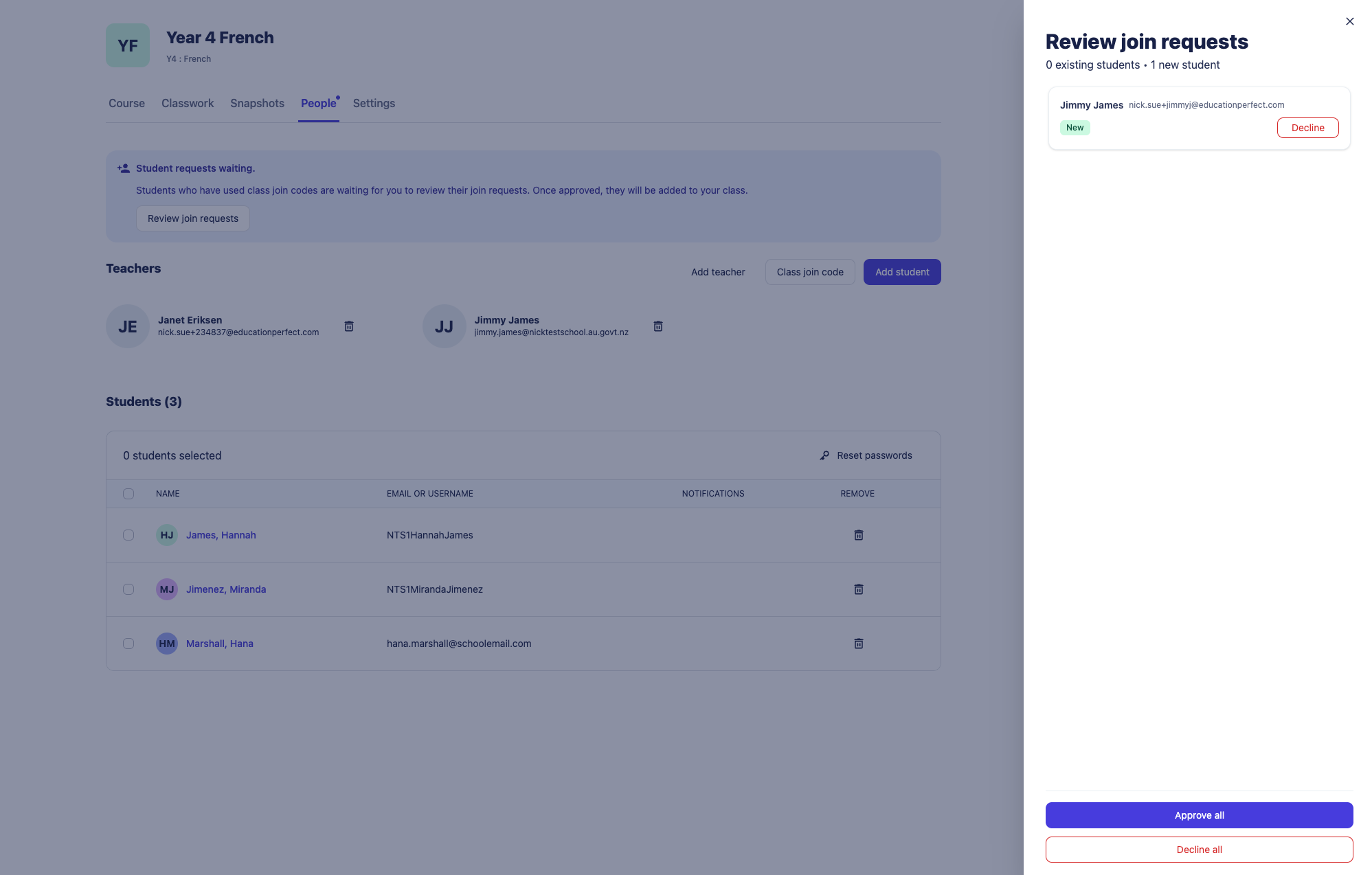 - Upon each student submitting their request to join your class, they will automatically have an account created where required and be added to your class upon approval.