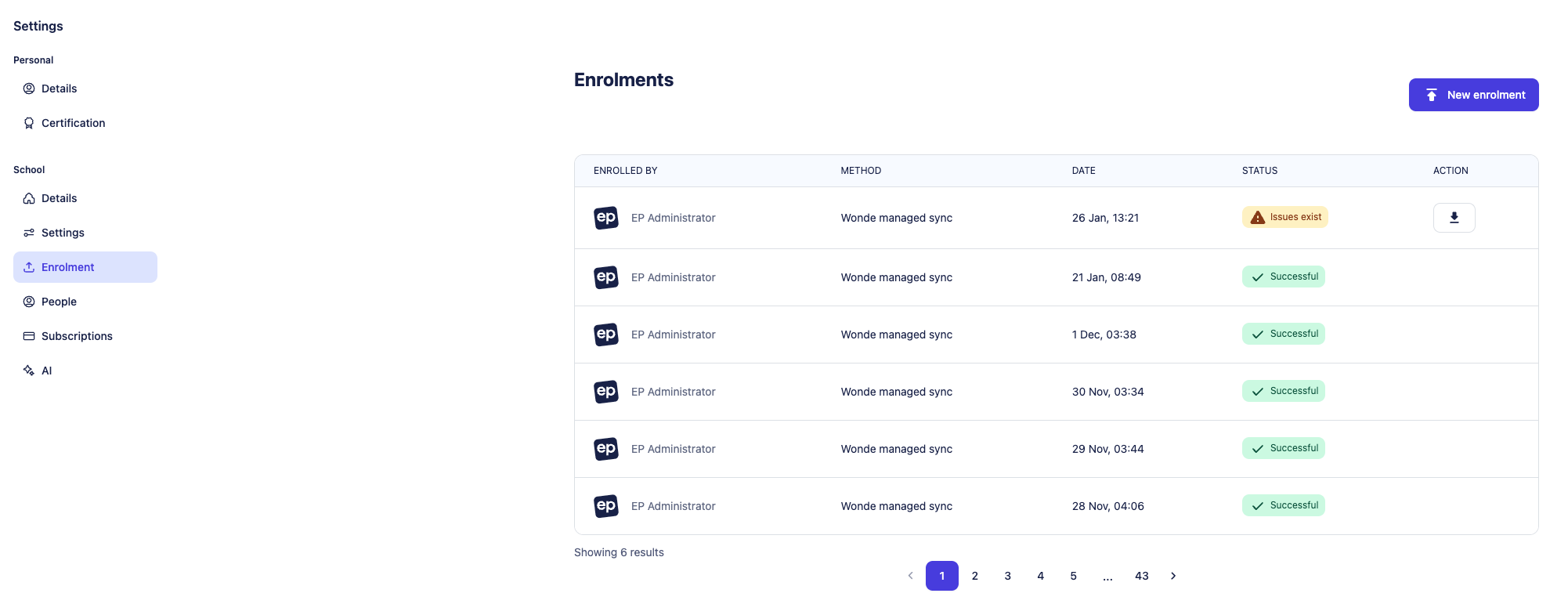 Each sync from Wonde to EP generates an entry in your school’s Enrolment History (located under Settings, then Enrolments). A status of Issues exist occurs when one or more classes or users weren’t able to be included in your sync. You’ll be able to download a CSV file detailing the specific issues.